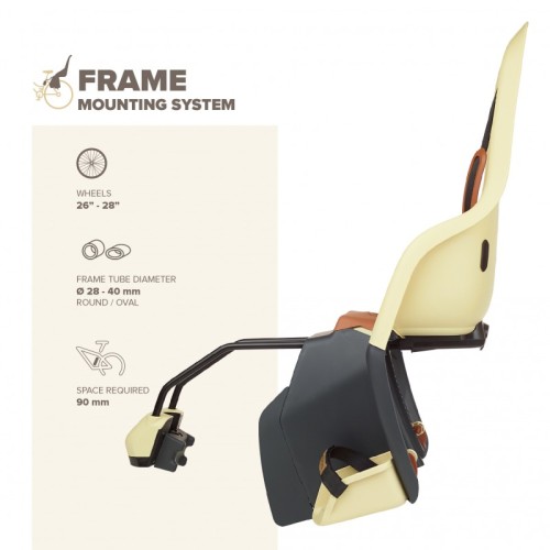 Foldable rear-mounted child bicycle seat designed for children aged 9 months to 6 years, with a maximum weight capacity of 22 kg. Suitable for city or MTB bikes/e-bikes. For Round and Oval Frames : Ø28 - 40 mm.